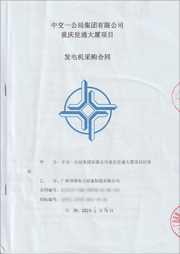 2021年6月16日,廣西頂博電力設(shè)備制造有限公司與中交一公局集團(tuán)有限公司重慶世通大廈項(xiàng)目部成功簽訂2臺(tái)上柴柴油發(fā)電機(jī)組,2臺(tái)機(jī)組均配有蓄電池、浮充電機(jī)、排風(fēng)管道、1000L日用油箱及其他常規(guī)驗(yàn)收應(yīng)配置完整的配套裝置。
