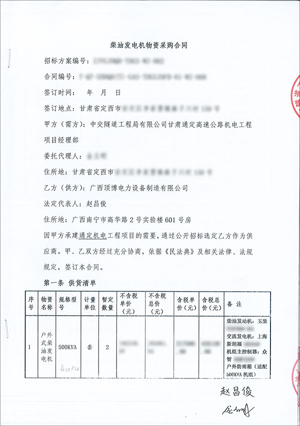 近日,中交隧道工程局有限公司因承建甘肅通定高速公路機(jī)電工程項(xiàng)目需要,與我司廣西頂博電力設(shè)備有限公司成功訂購400kw/160kw/504kw玉柴柴油發(fā)電機(jī)組共5套,其中400kw玉柴柴油發(fā)電機(jī)組共2套,選配戶外防雨箱;160kw戶外式玉柴柴油發(fā)電機(jī)組1套,選配戶外防雨箱;504kw玉柴柴油發(fā)電機(jī)組2套,頂博電力與中交隧道工程局已進(jìn)行多次合同,十分感謝貴公司對頂博電力的支持與認(rèn)可!